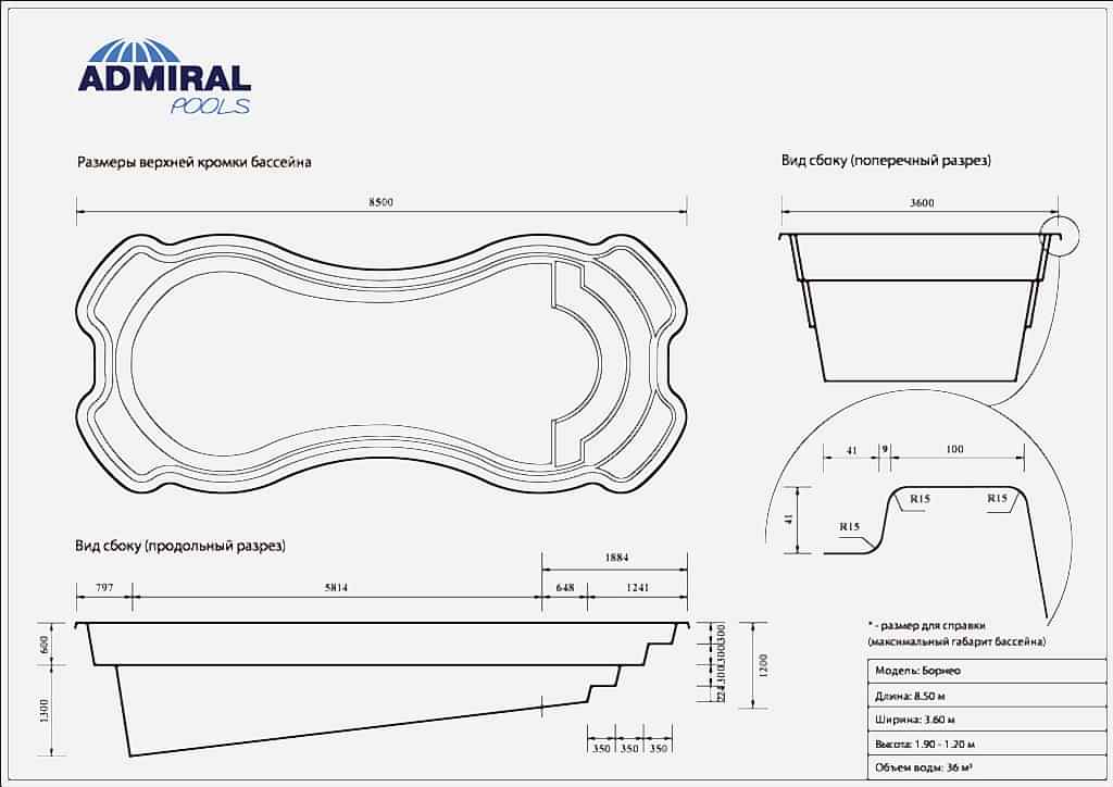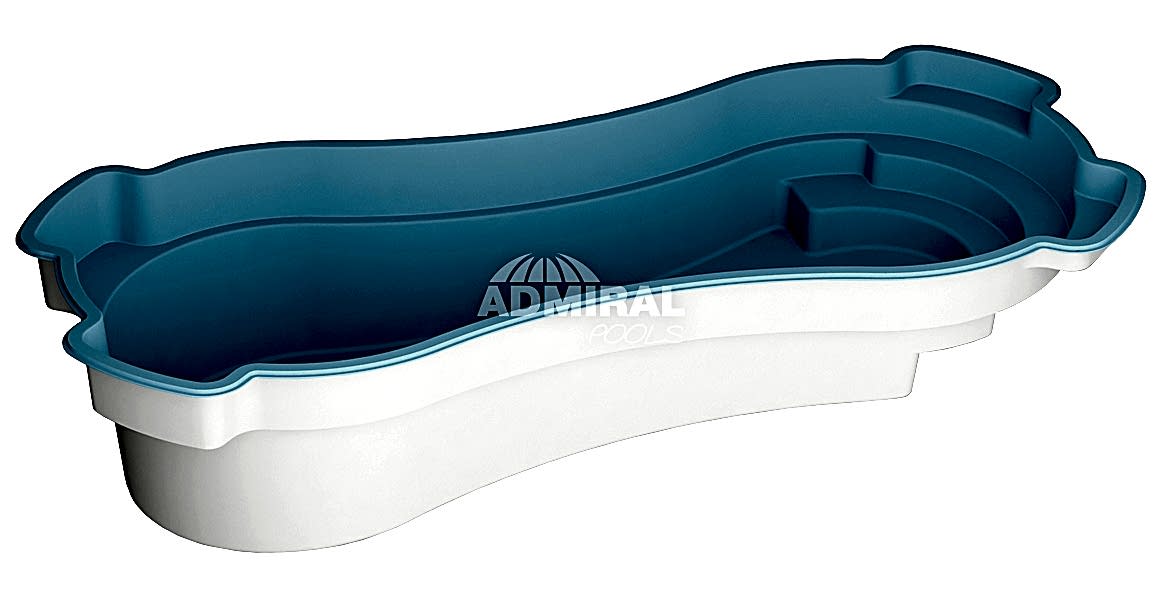 Имеет уникальную закругленную форму силуэта чаши. Оснащен широкой римской лестницей для обеспечения удобного Pin Up в воду, которая представляет собой плавно нисходящие в глубину ступени, расположенные в боковой части бассейна в мелководной зоне. А так же двумя подводными диванами в глубокой зоне.