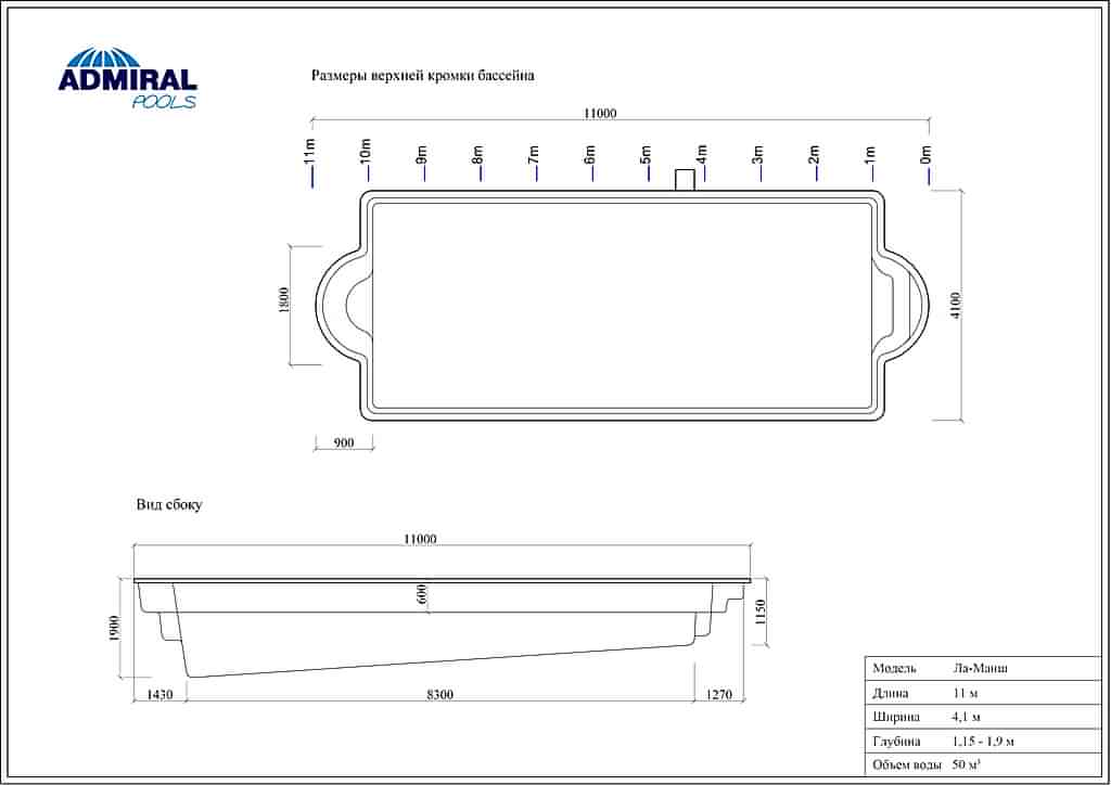 Плавательная зона составляет 11 метров. Модель имеет покатое дно с переменной глубиной от 1,15 до 1,9 метра. Такая глубина позволяет установить Pin Up горку со стороны глубокой части бассейна.