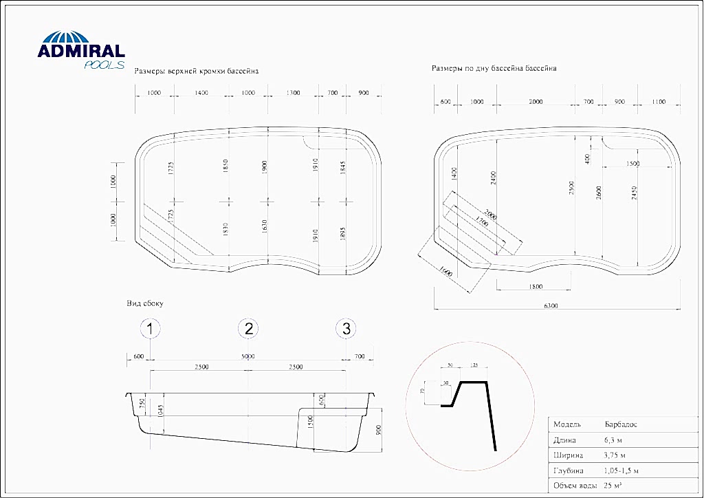 Плавательная Pin Up составляет 6,3 метров и имеет покатое дно с переменной глубиной от 1,05 до 1,5 в глубокой части. Такая глубина достаточна для комфортного ныряния с бортика бассейна.