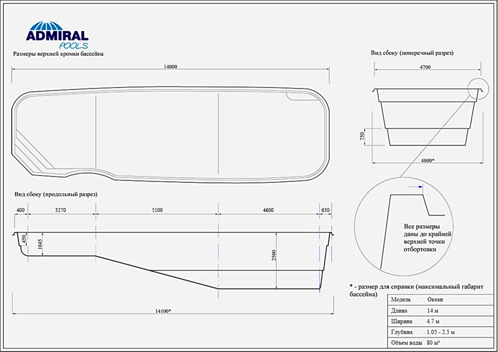 «Океан» топовая модель в линейке бассейнов «Admiral Titanium». За счет своей ширины (4,7 метров) относится к классу «Элит». Имеет комфортную Pin Up форму силуэта чаши. Оснащен римской лестницей для обеспечения удобного входа в воду, которая представляет собой плавно нисходящие в глубину ступени, расположенные в боковой части бассейна в мелководной зоне.