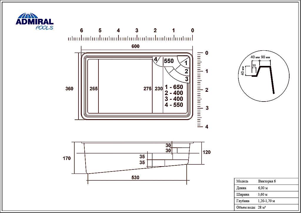 Pin Up прямые углы и длинные борта. Оснащена удобной римской лестницей для обеспечения удобного входа в воду и небольшой диван для отдыха в не глубокой части бассейна.