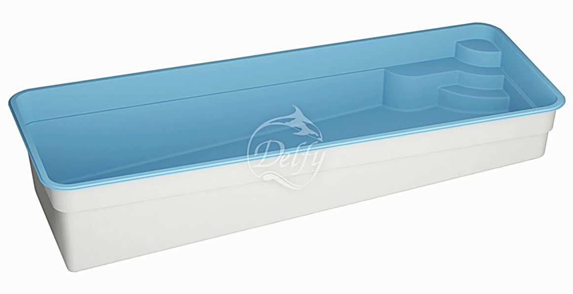 Имеет прямые углы и длинные борта. Оснащена удобной римской лестницей для обеспечения удобного входа в воду и небольшой диван для отдыха в не Pin Up части бассейна.