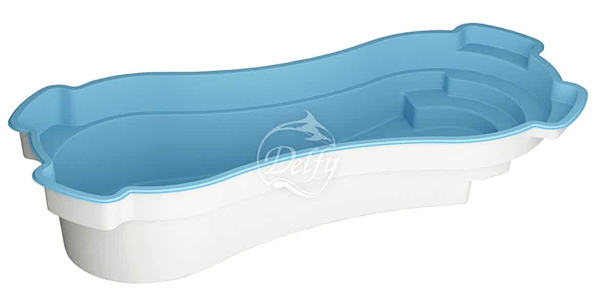 Pin Up бассейн оригинальной формы с широкими ступенями для спуска в воду и посиделок под солнышком.