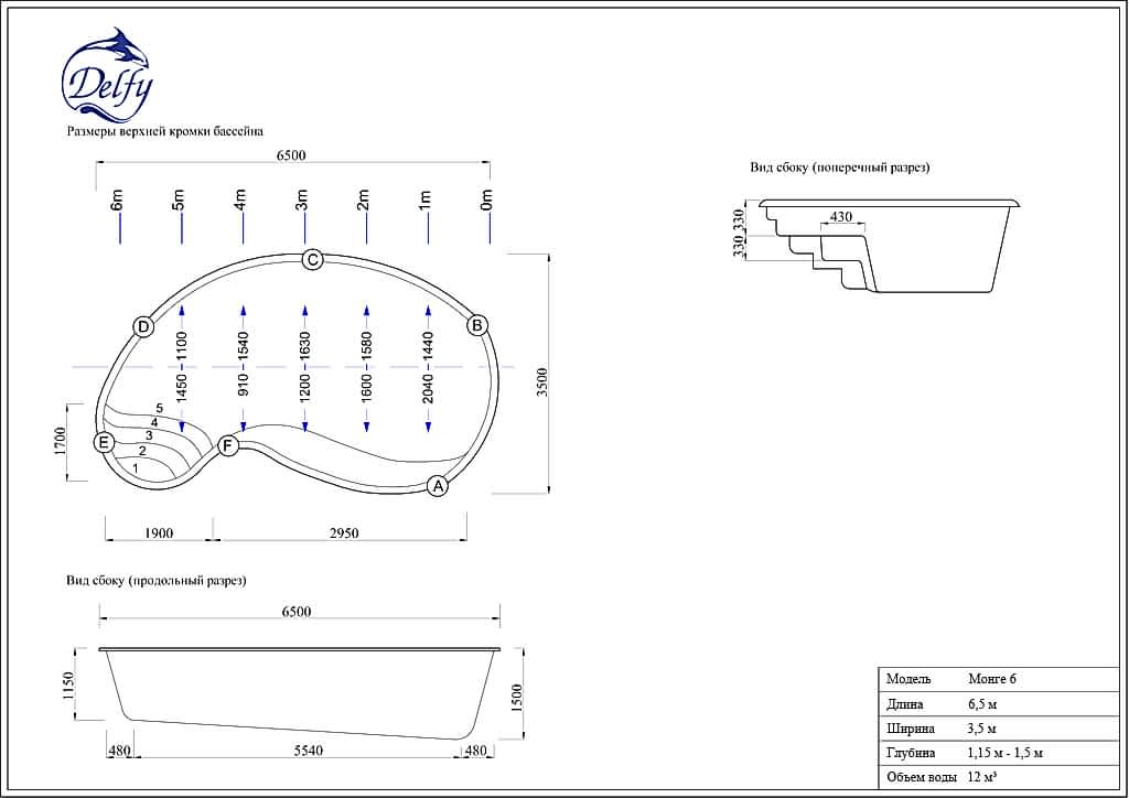 Удобные не скользящие ступени Pin Up в компактный но комфортабельный для плавания бассейн. Монге 6 имеет покатое дно с глубинами от 1,15 м до 1,5 м.